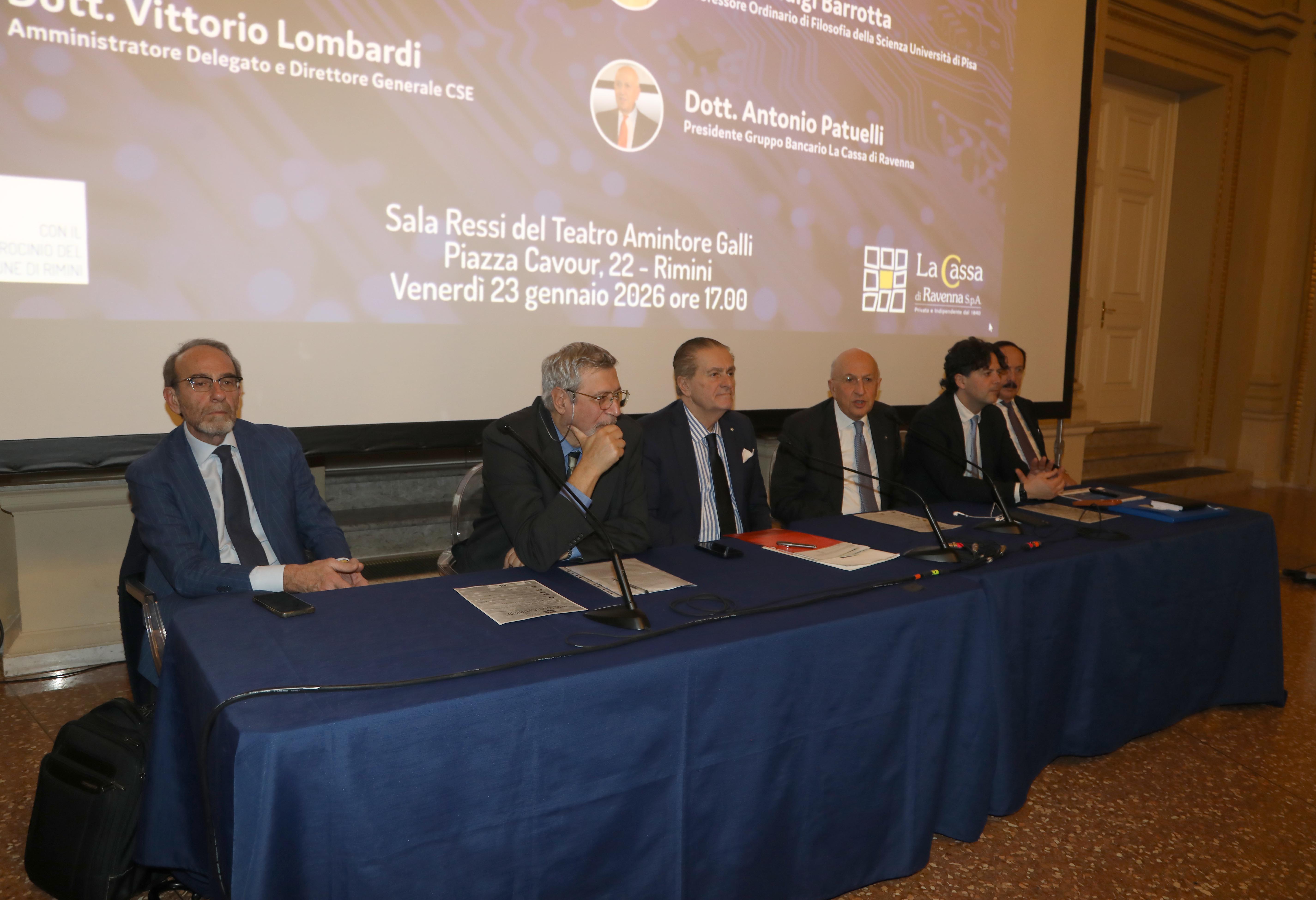 Il convegno è stato aperto dal Presidente della Conferenza, il Direttore Generale della Cassa Nicola Sbrizzi, e dai saluti del Prefetto di Rimini Giuseppina Cassone e dell’Assessore alla Transizione Digitale del Comune di Rimini Mattia Mario Morolli. Poi hanno preso la parola i relatori, ovvero il Presidente del Gabinetto Scientifico-letterario Vieusseux di Firenze Riccardo Nencini, il professor Pierluigi Barrotta, docente ordinario di Filosofia della Scienza all’Università di Pisa e l’Amministratore Delegato e Direttore Generale del CSE Consorzio Servizi Bancari Vittorio Lombardi.