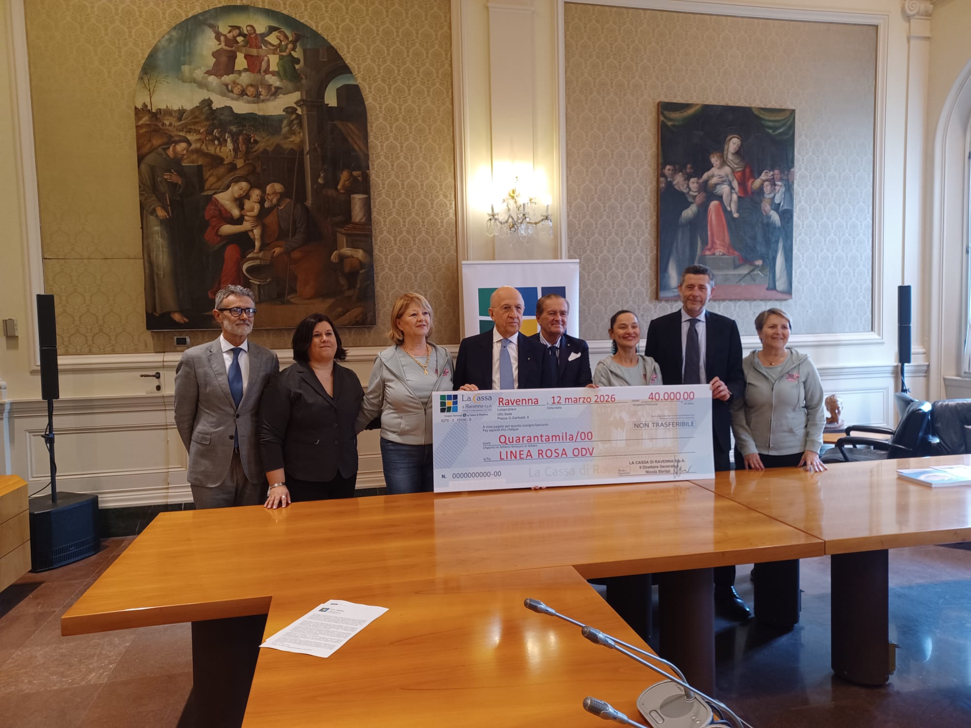 Un assegno da 40.000 euro è stato consegnato questa mattina dal Presidente della Cassa di Ravenna Spa Antonio Patuelli e dal Direttore Generale Nicola Sbrizzi all’Associazione Linea Rosa. E’ il risultato ottenuto dalla Cassa di Ravenna, anche grazie alla sensibilità ed alla partecipazione di molti risparmiatori e sottoscrittori, con il prestito obbligazionario senior collocato anche al fine di sostenere l’attività di Linea Rosa, attraverso la devoluzione dello 0,20% una tantum sull'importo totale sottoscritto di obbligazioni con scadenza triennale. All'incontro per la consegna dell'assegno erano presenti anche il Vice Direttore Generale Vicario della Cassa di Ravenna Alessandro Spadoni, la Presidente dell'Associazione Linea Rosa Alessandra Bagnara, la Vice Presidente Monica Vodarich, la consigliera Gaia Marani, la direttrice strategica Denise Camorani ed il Responsabile dell'Area Commerciale della Cassa di Ravenna Matteo Ramilli.